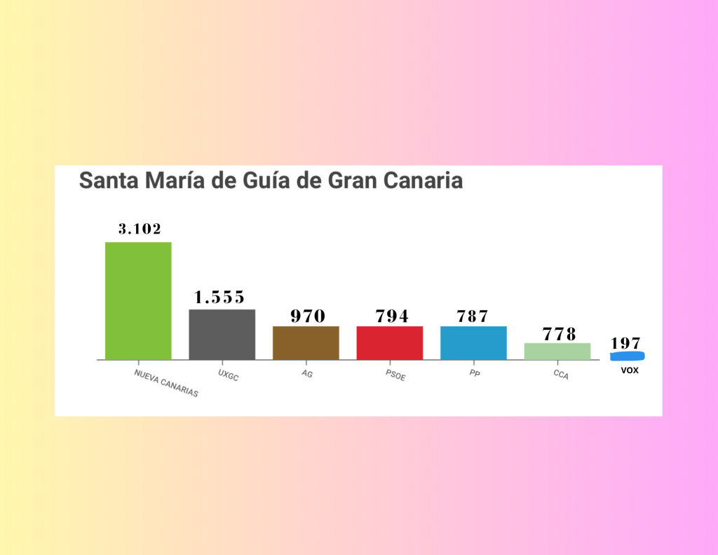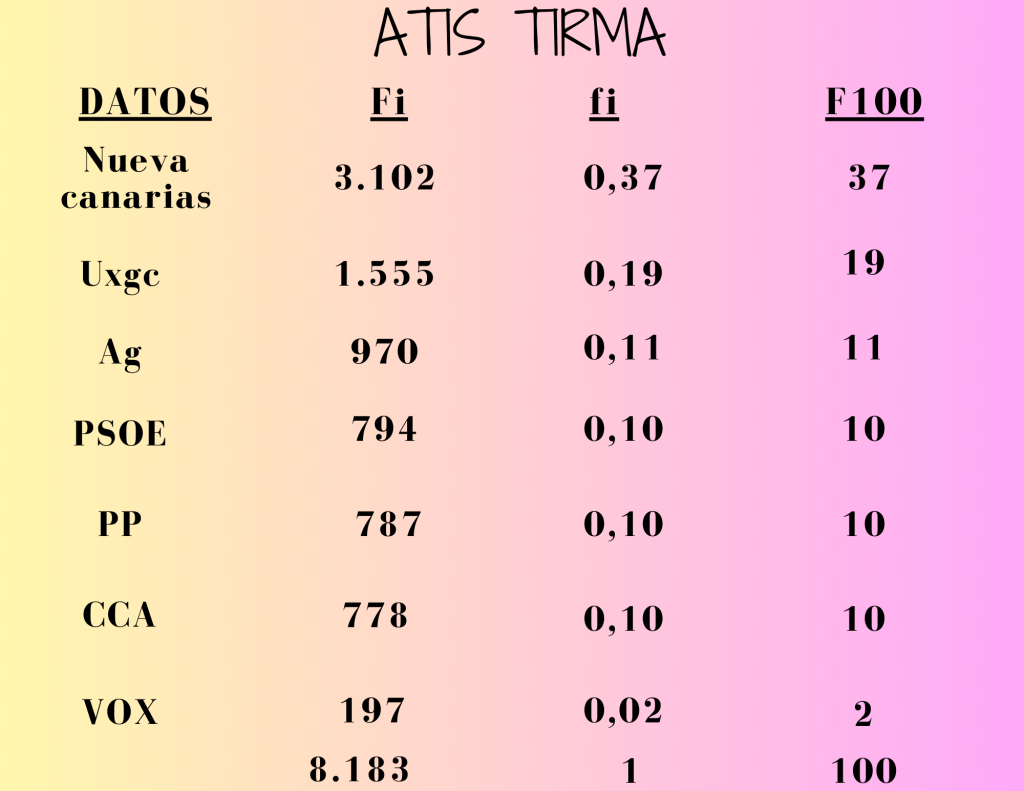 El alumnado de 1º ESO en la asignatura de matemáticas, dentro del apartado de Estadística, ha aprovechado la celebración de las últimas elecciones municipales de 2023 en la isla de Gran Canaria para elegir un municipio de la isla y realizar una tabla estadística de frecuencias, así como un diagrama de barras en el que se observan los resultados de los distintos partidos políticos dentro del propio municipio.